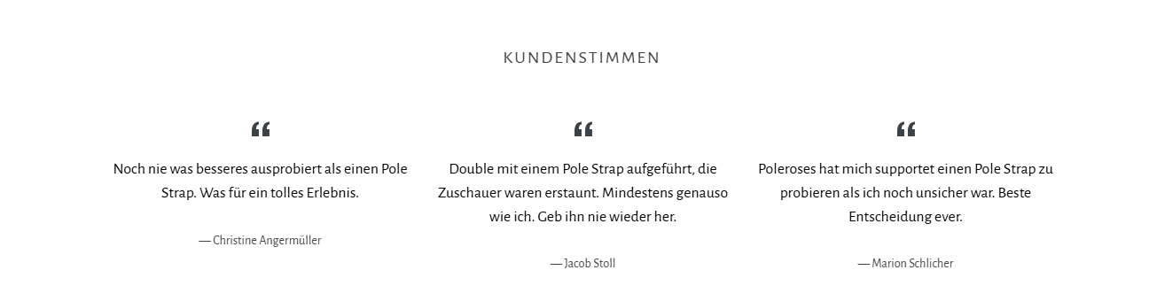 Als ich 2019 meine Leidenschaft für Pole Dance entdeckte, wurde mir schnell klar, wie wichtig hochwertige und durchdachte Ausrüstung für das Training ist. Mit der Zeit entwickelte ich den Wunsch, Produkte zu schaffen, die Pole-Dancern mehr Sicherheit und und Spaß am Training bieten. So entstanden der Pole Strap – innovatives Hilfsmittel, das sowohl Anfänger als auch Fortgeschrittene unterstützt.